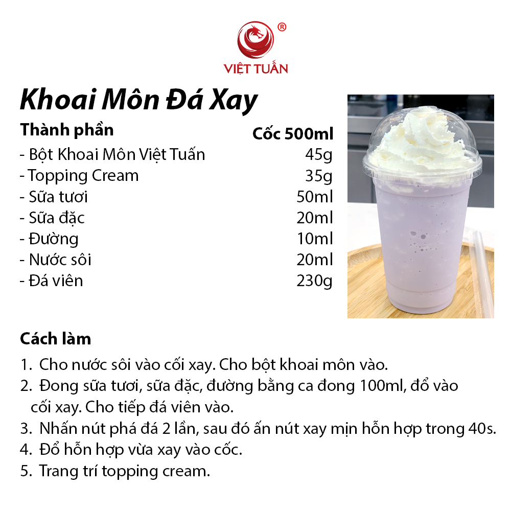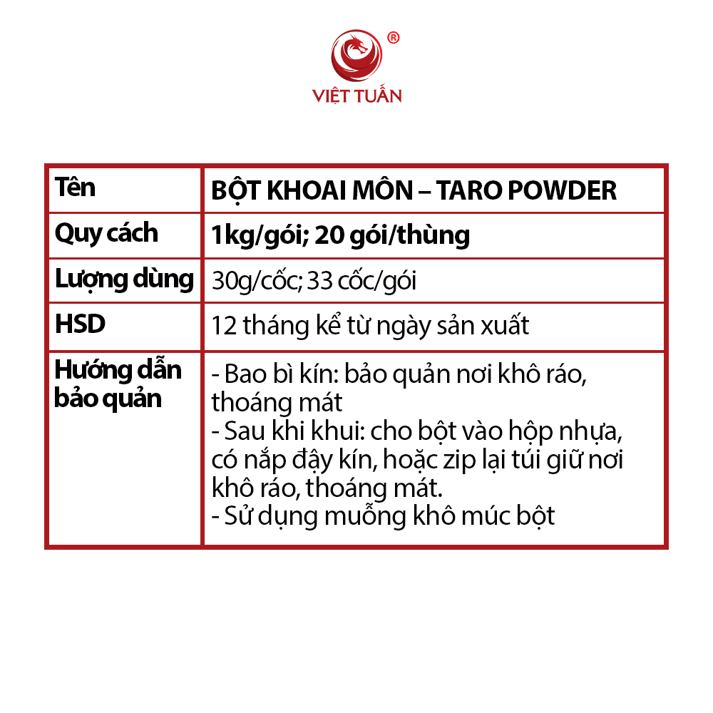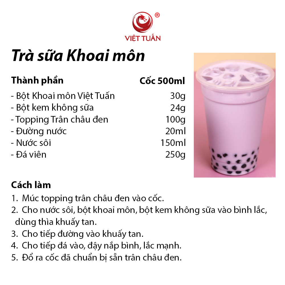 - Bột khoai môn Việt Tuấn chuẩn hương vị Đài Loan, với hương vị đậm đà. Được làm từ bột khoai môn nguyên chất, mang đến hương thơm tự nhiên, tươi mát và đầy quyến rũ.